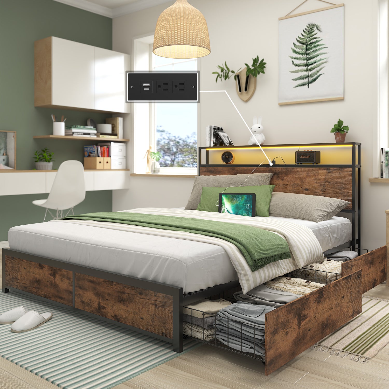 Lifezone Bed Frame with 2-Tier Storage Headboard, Metal Platform Bed Frame with 4 Storage Drawers, Built in Charging Station & LED, Noise-Free/Metal Support/No Box Spring Needed