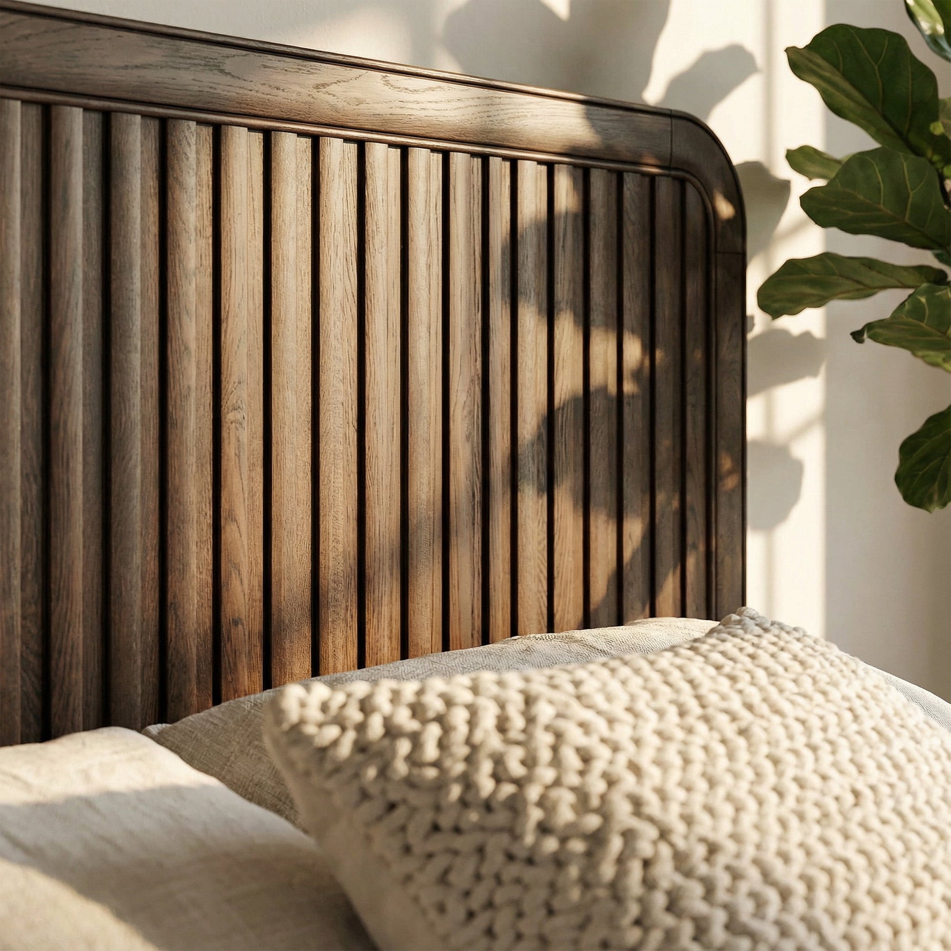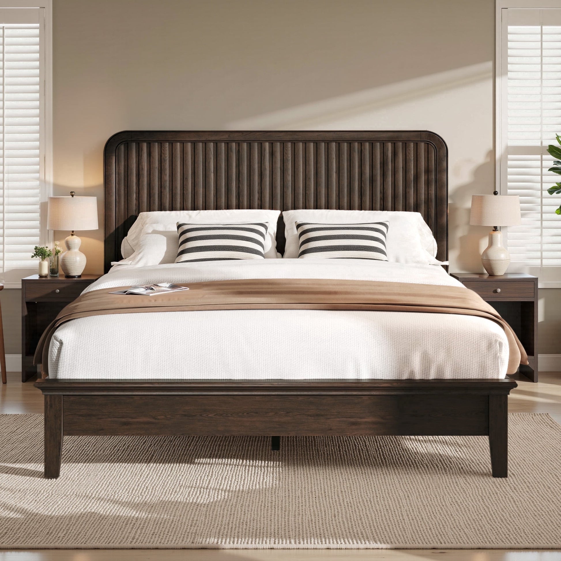 This Fluest solid wood bed frame features a unique vertical slat headboard, with a dark walnut finish that delivers a rustic, timeless look to complement a variety of home decor styles. Its sturdy solid wood construction, paired with reinforced slats, provides stable, noise-free support for up to 800 lbs and eliminates the need for a box spring. The low-profile design makes it easy to get in and out of bed, and assembly is hassle-free with included tools and clear instructions. Combining durability with modern rustic charm, this bed frame creates a practical and stylish sleeping experience for your bedroom.
