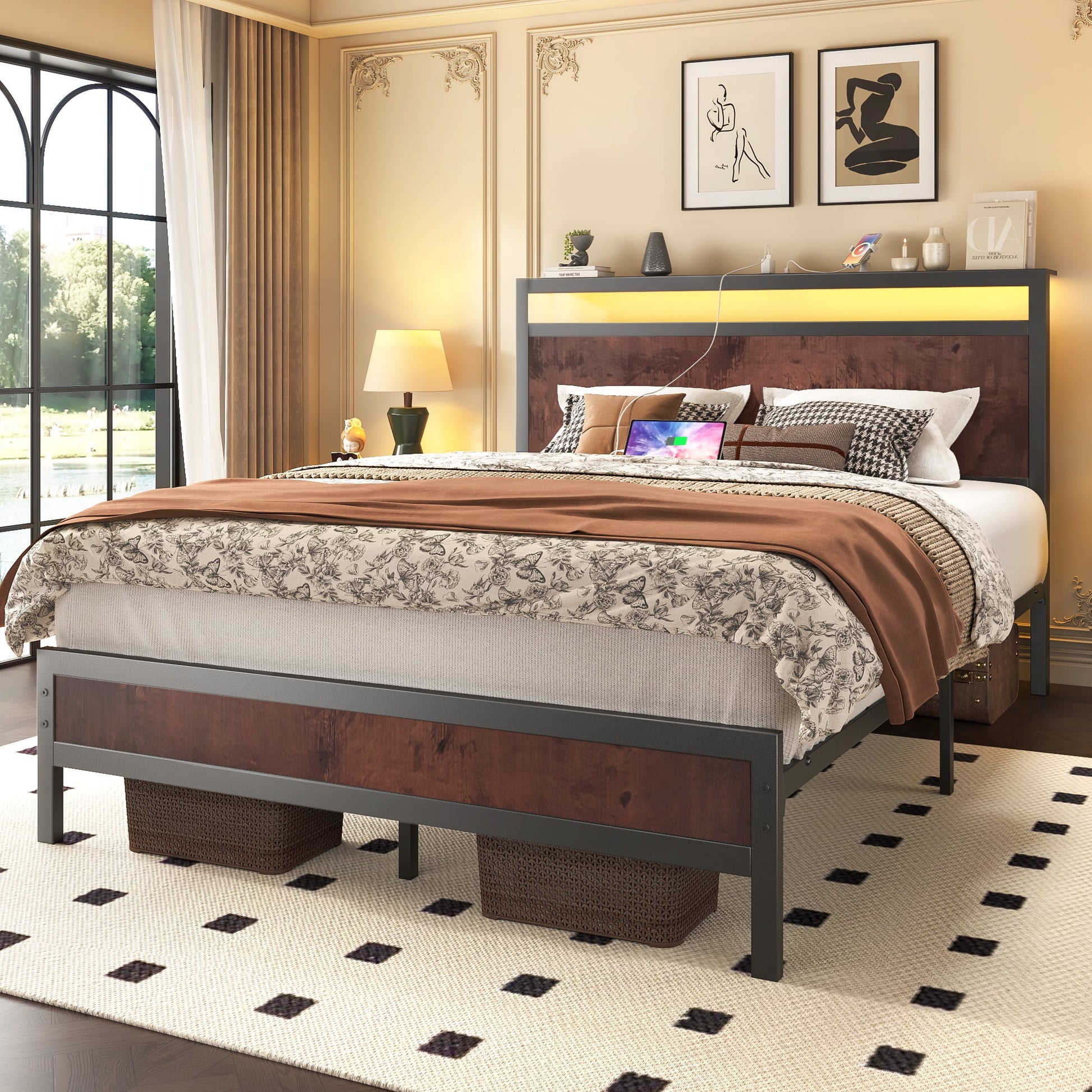 Full Bed Frame with Storage Headboard & Storage Drawer, Charging Station & LED Light, No Box Spring Needed, Noise Free, Easy Assembly, Vintage Brown