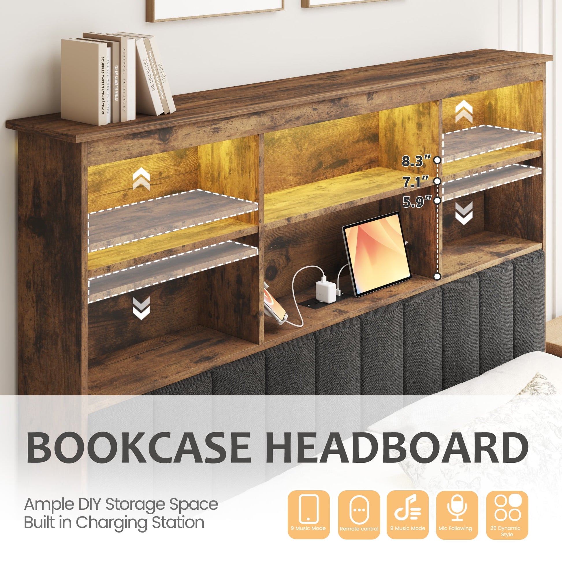 - Bookcase headboard with two tiers and six storage spaces to keep your bedroom organized and clutter-free