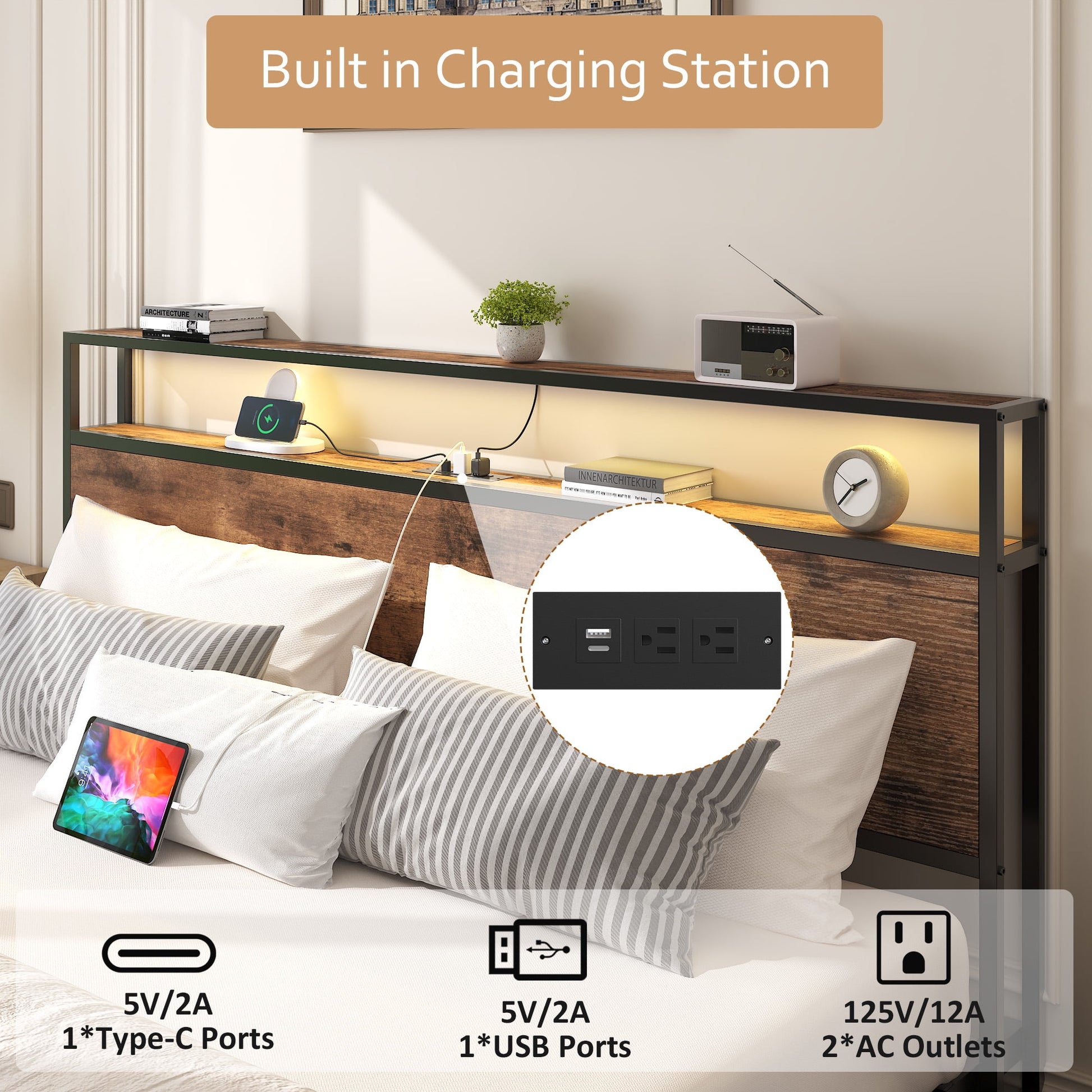 - Dual-tier headboard and charging station: The double headboard is equipped with two standard sockets, a USB socket, and a Type-C socket to meet the changing needs of your electronic devices, ensuring you can enjoy using your electronics in bed. At the same time, the middle compartment offers some storage space for your electronics and books.