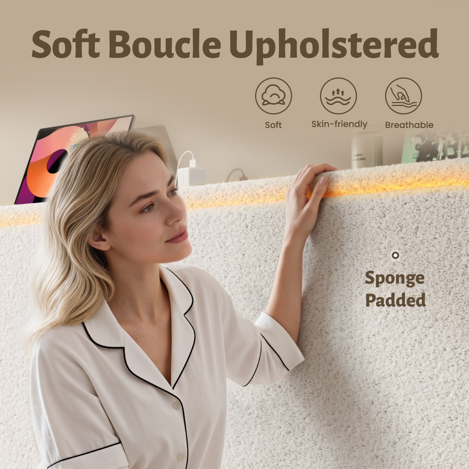 - 【LUXURIOUS BOUCLE CLOUD COMFORT & SUPPORT】 Experience the ultimate in cozy relaxation. Dubbed the "Cloud Bed" for a reason, it's upholstered in premium, soft-touch boucle fabric that's both stylish and durable. The fully padded headboard provides a plush, comfortable backrest for reading or watching TV, transforming your bedroom into a serene retreat