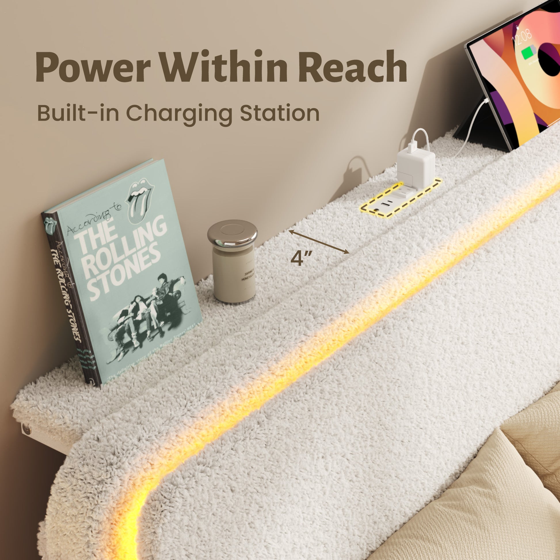 Lifezone Queen Bed Frame with Charging Station & LED Lights, Boucle Upholstered Cloud Bed with Headboard and Shelf, Noise Free, Sturdy Metal Support, No Box Spring Needed, Soft Rounded Corners, Beige