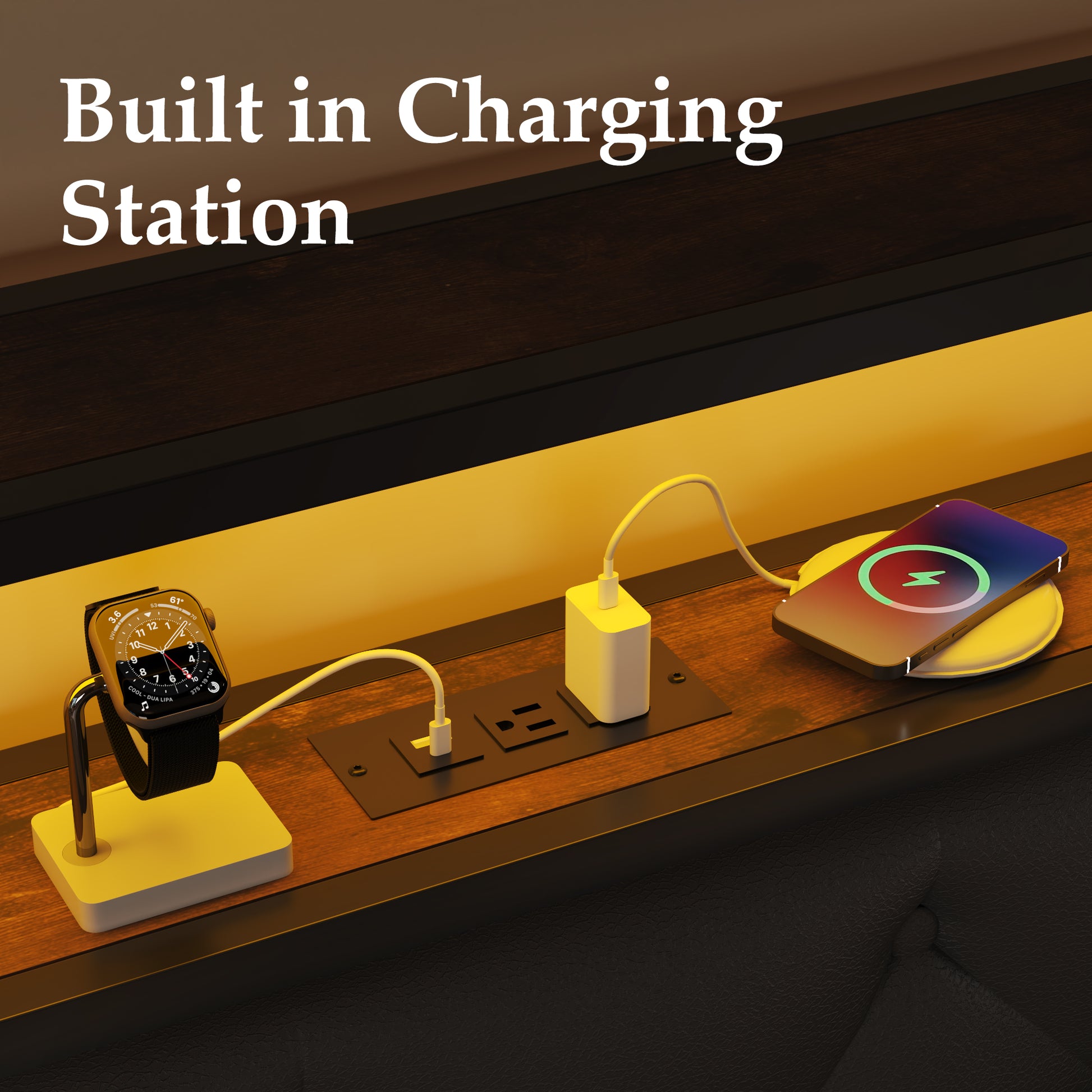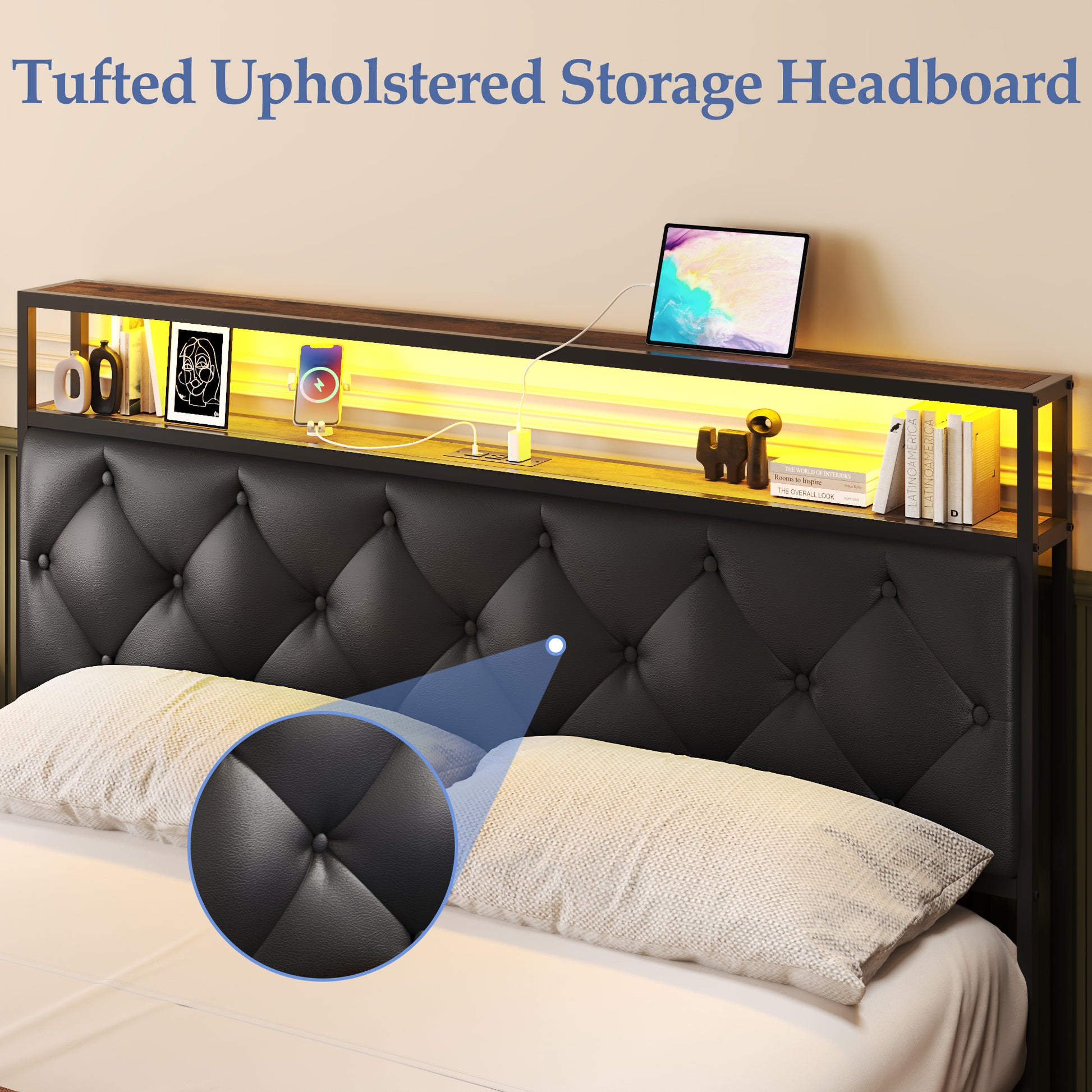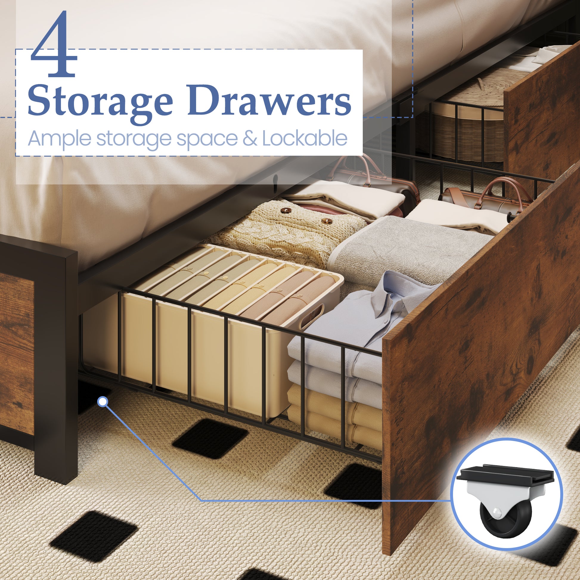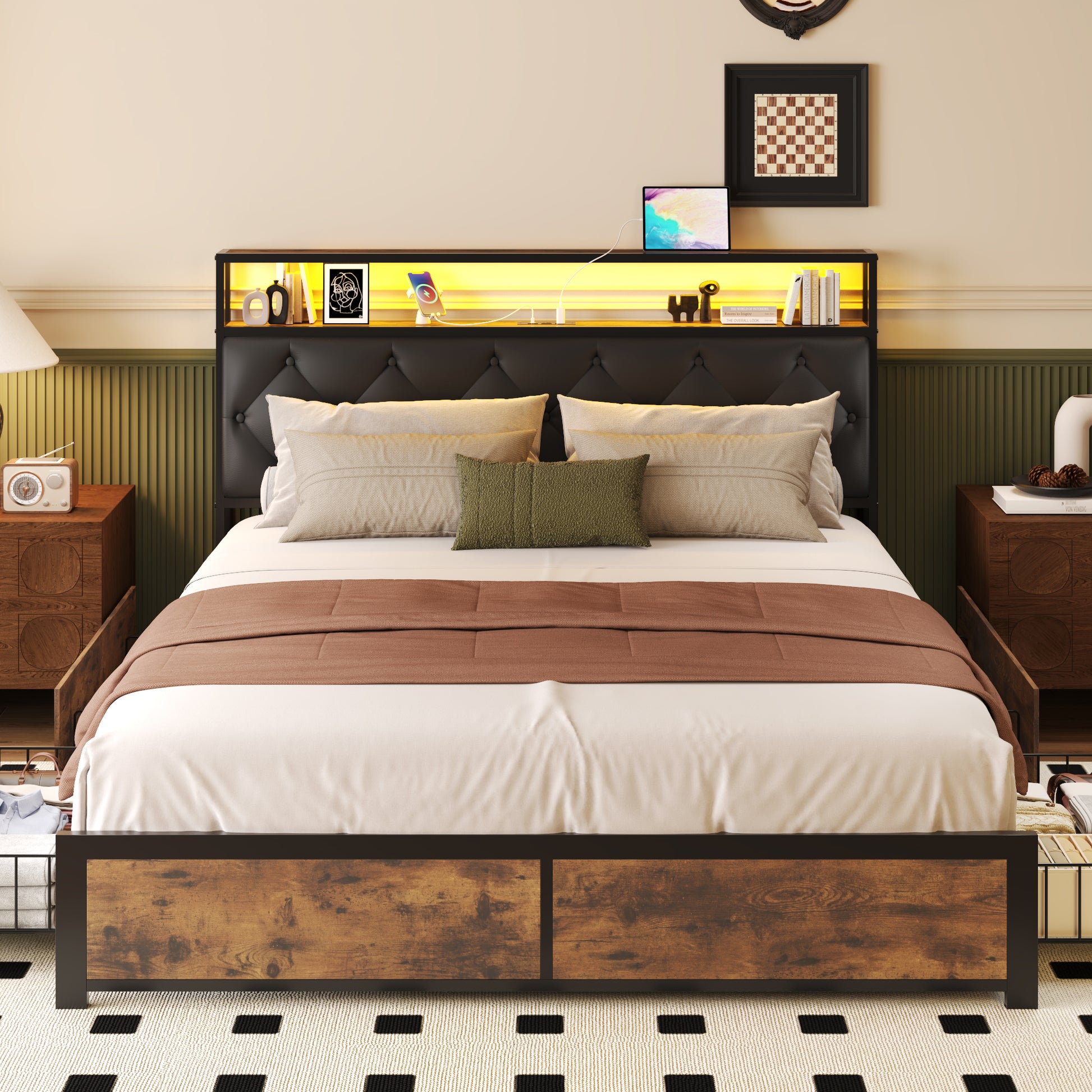Lifezone Queen Bed Frame with Headboard Platform Bed with Charging Station & LED, 4 Storage Drawers, Metal Support