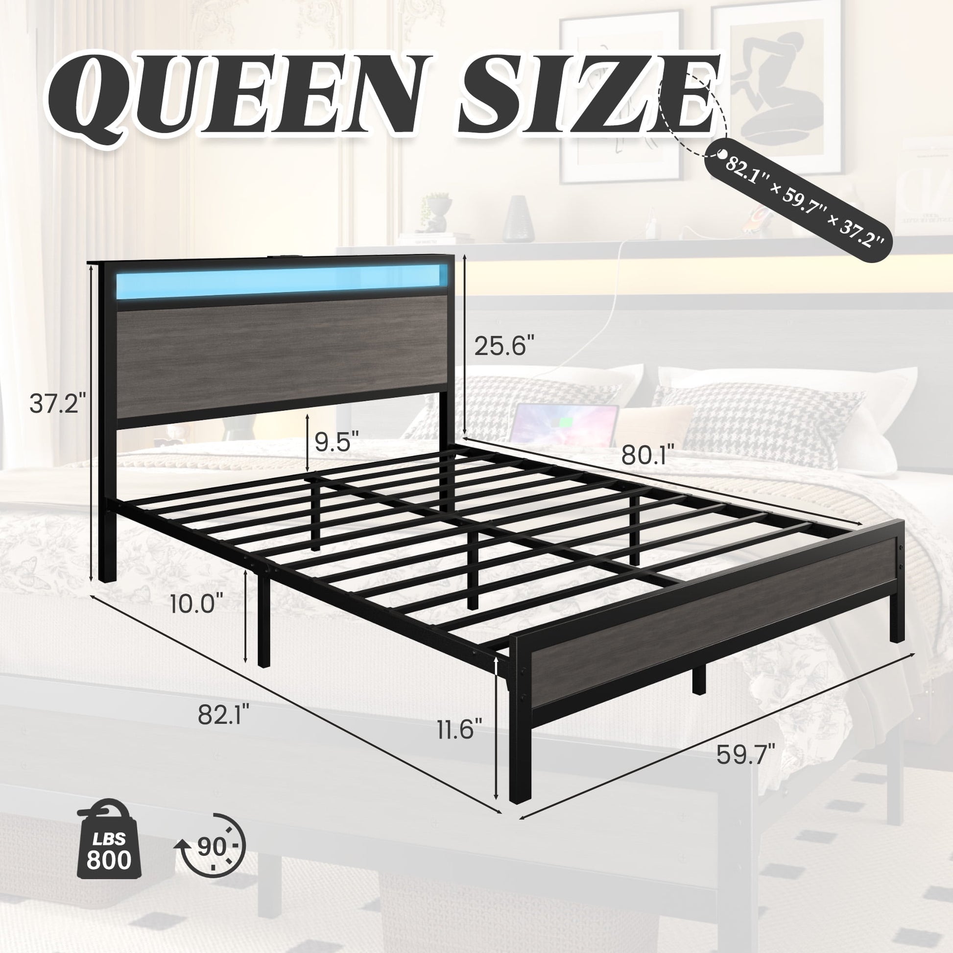 Queen Bed Frame with Headboard & Footboard, Bed Frame with Built-in Charging Station & LED Light, Storage Shelf, Noise-Free, No Box Spring Needed, Easy Assembly, Rustic Grey